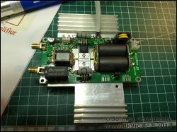 Especially the filter is worth a look. Building the kit was not too hard, but the surface-mount (SMD) parts are very tiny and you need a calm hand and good eyes. When I had everything assembled I tested it without a heatsink on the two IRF530N mosfets from IOR. It took not more than five seconds to kill both FETs while sending an AM carrier (1,5W drive). I ordered a pack of five new IOR IRF530N mosfets on Ebay which arrived today. After the QRL I soldered them in, and I drilled the holes into two pieces of an old heatsink harvested from an old PC power supply.
